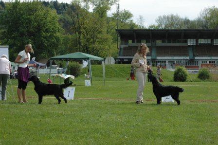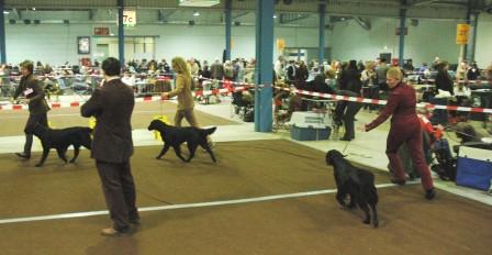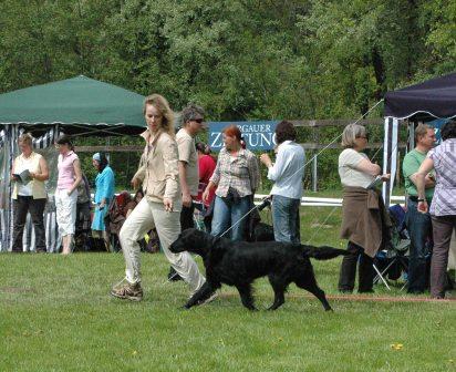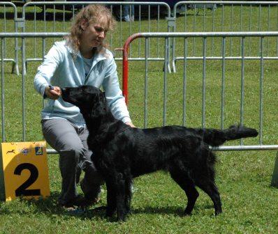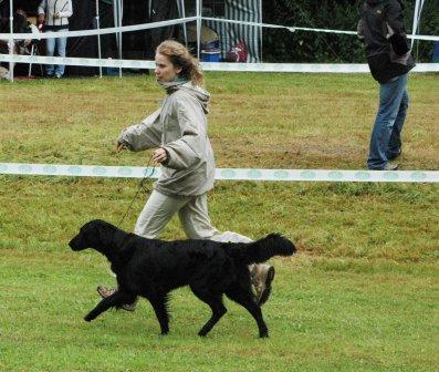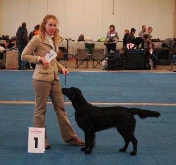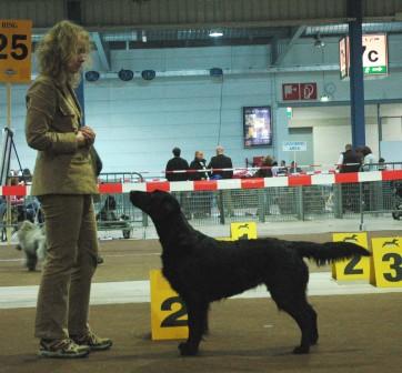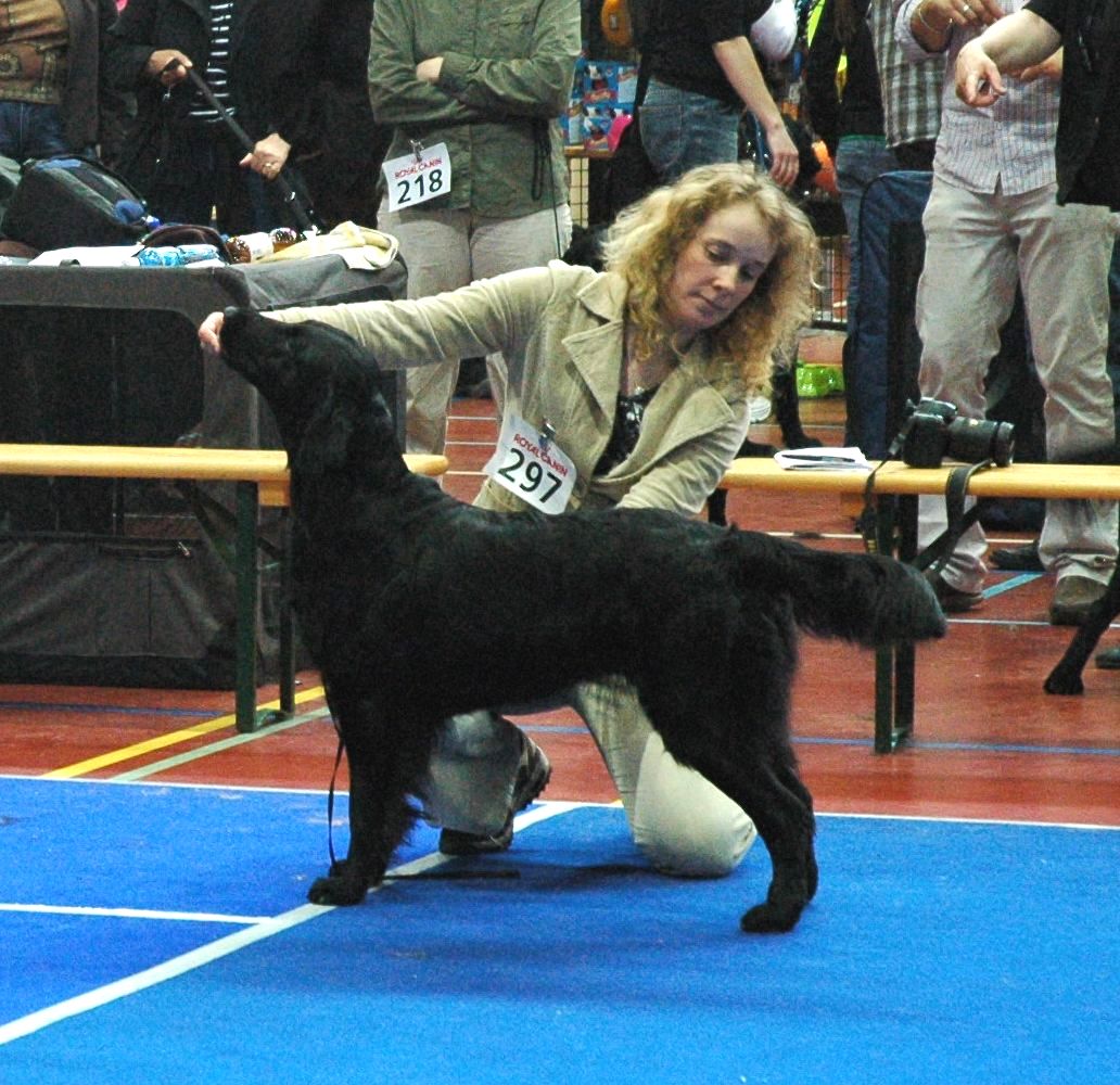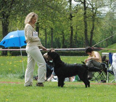 Großrahmige Hündin, Kopfform korrekt, etwas rundes Auge. Langer, kräftiger Hals. Kräftige Knochen. Etwas steiler Oberarm, korrekte Katzenpfoten, gut gewölbte Brust. Starkes Trimmen am Hals stört die Harmonie. Flüssige Bewegung |