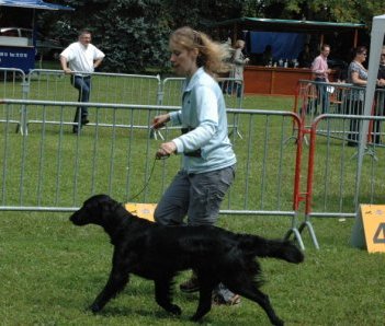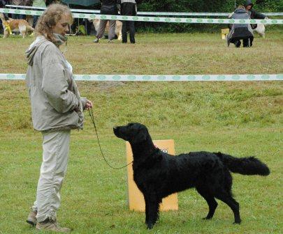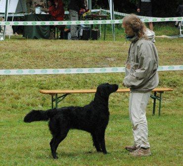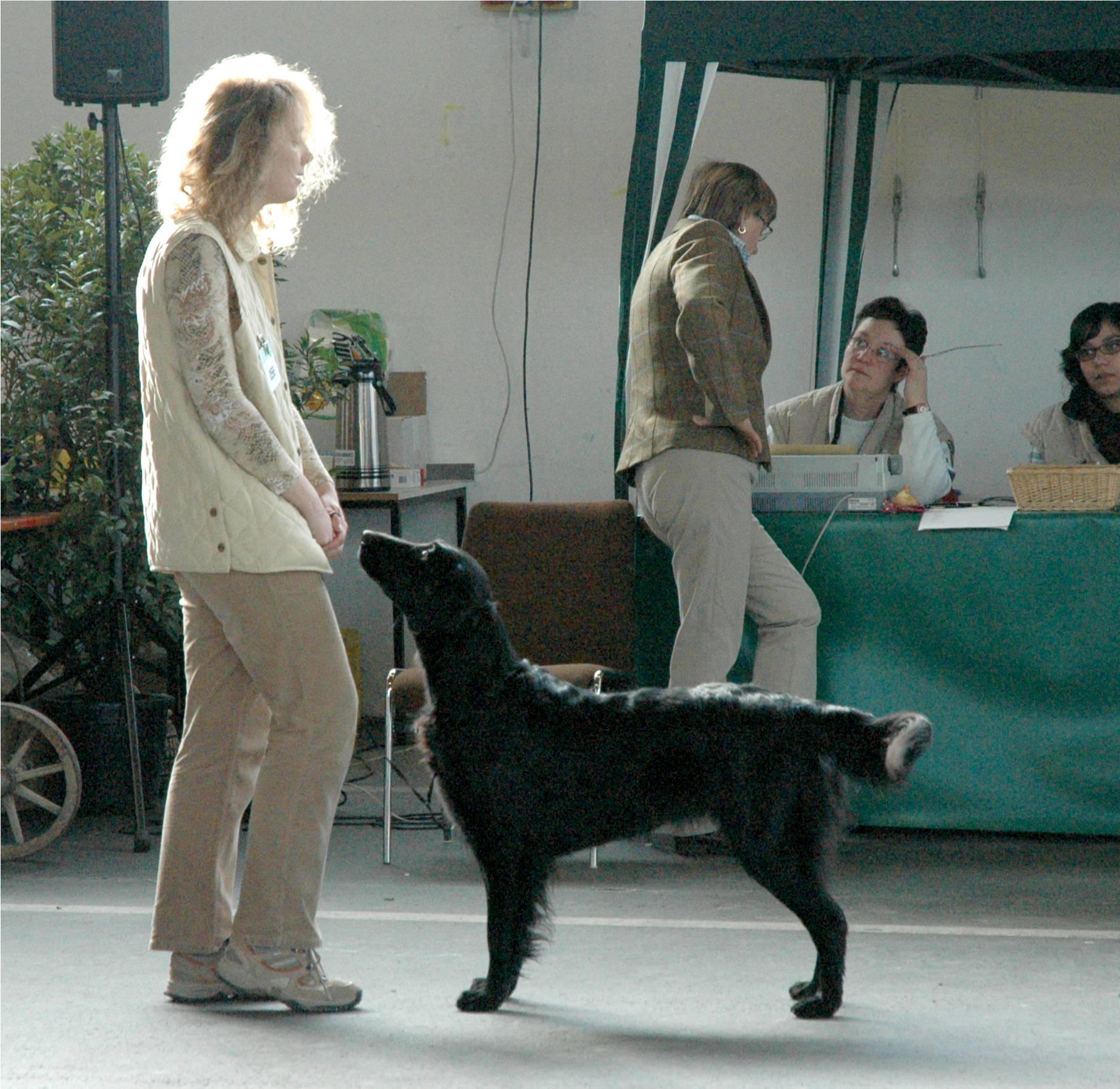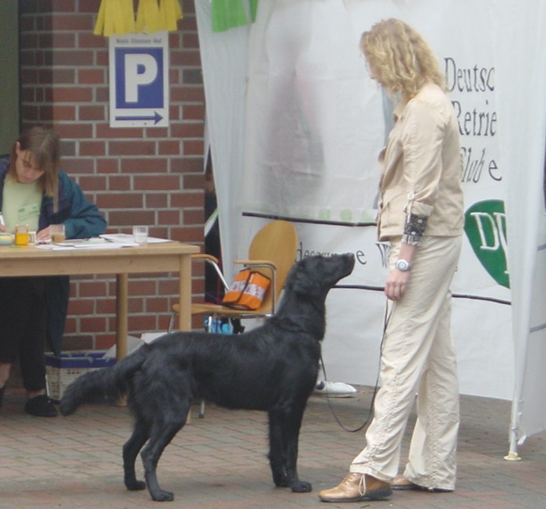 Substanzvolle gut proport. Hündin, schöner Kopf, etwas gebrochene Rückenlinie, tiefe Brust, steht parallel, gut gewinkelt, hinten etwas ausgedrehte Pfoten (mensch Frauchen darauf musst du doch achten) , geht vorne etwas o-beinig. |